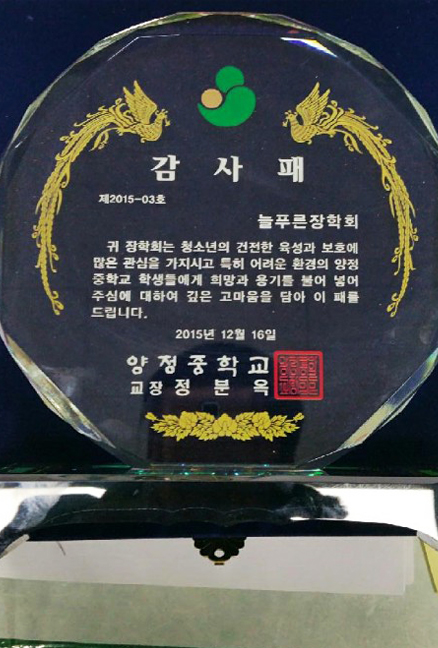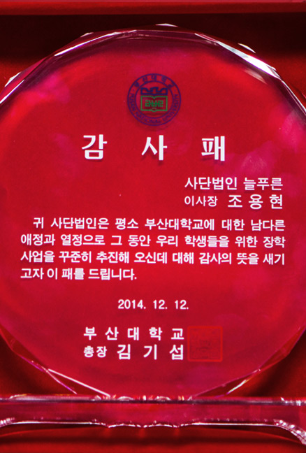 외부 감사패 수령 현황(2016년 1월 현재) 관리자2016.01.2634519 첨부파일 총장감사패.jpg , 03.jpg , IMG_6662.jpg , 02.jpg , 8_3_1452582654.jpg , 06.jpg 부산대학교 김기섭 총장 감사패(2014. 12. 12) 금정구장애인복지관 박재민 관장 감사패(2014. 12. 16) 양정중학교 정분옥 교장 감사패(2015. 12. 16) 목록 이전글(사)늘푸른 2016년 정기총회 알림다음글2016년 제1회 집행이사회 개최 알림