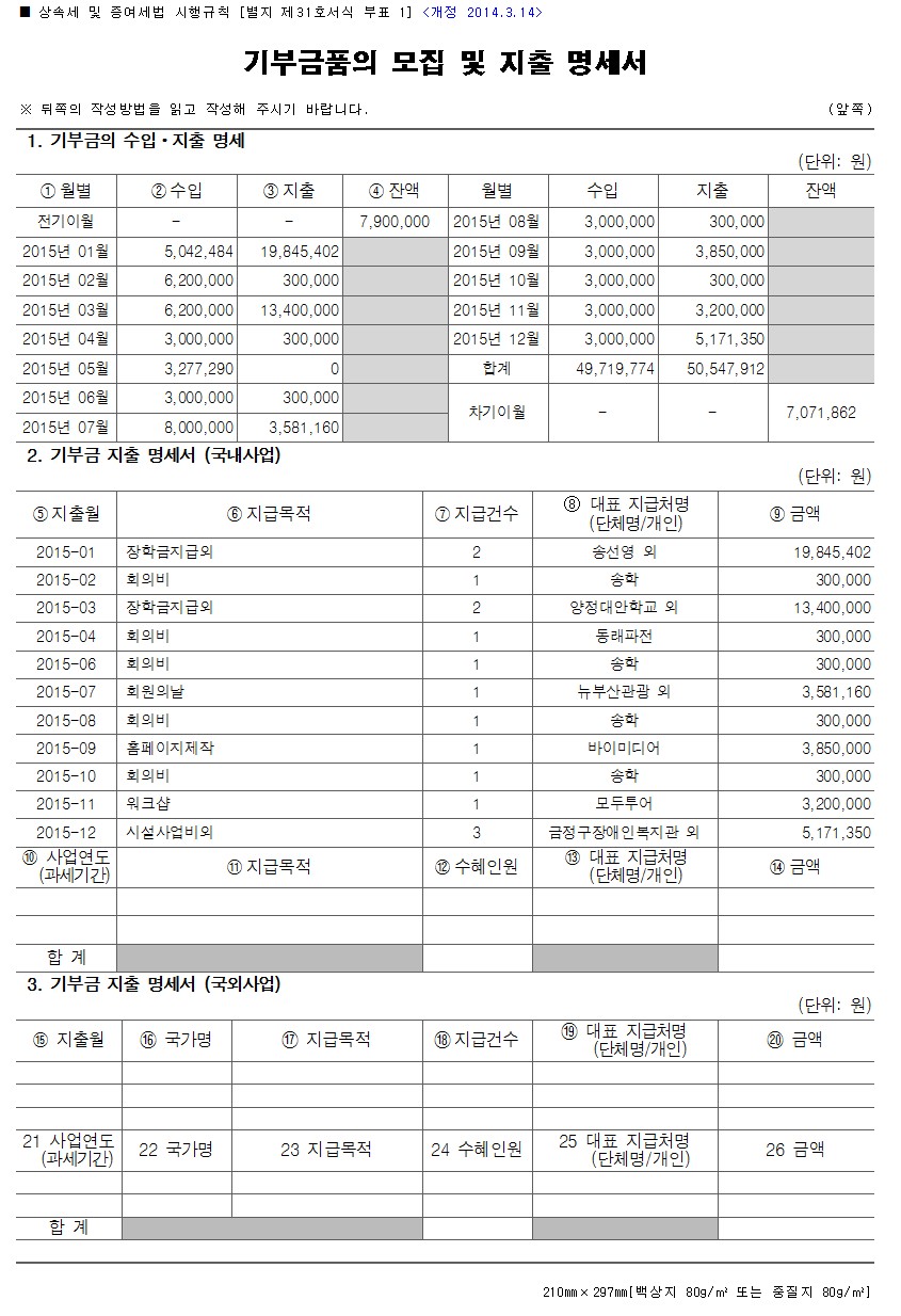 (사)늘푸른 기부금품의 모집 및 지출 명세서(2015년) 관리자2016.05.2535066 첨부파일 (사)늘푸른 기부금품 모집 및 지출명세서.jpg (사)늘푸른 기부금품의 모집 및 지출 명세서 목록 이전글2016년 제1회 상임이사회 개최 알림 다음글제2회 회원의 날(신입회원 환영회 겸) 행사 ..