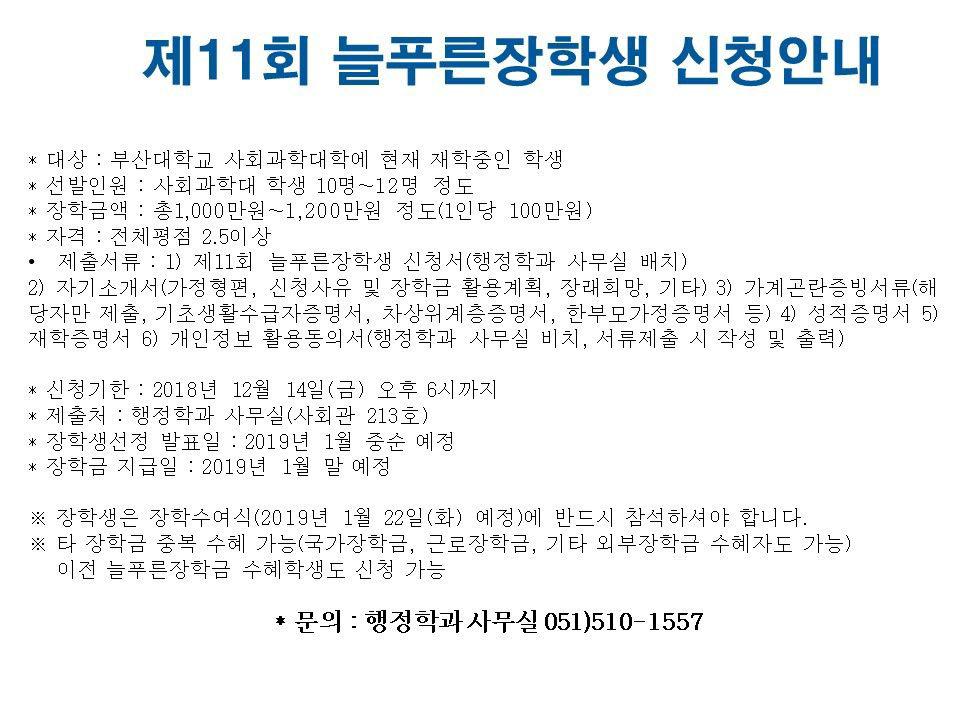 제11회 늘푸른장학생 신청 안내 관리자2018.12.0132872 첨부파일 photo_2018-12-01_17-59-54.jpg 제11회 늘푸른장학생 신청 안내 목록 이전글[공지] 기부금 모금액 및 활용실적명세서(20..다음글(사)늘푸른 2019년 정기총회 & 장학금 수여식 ..