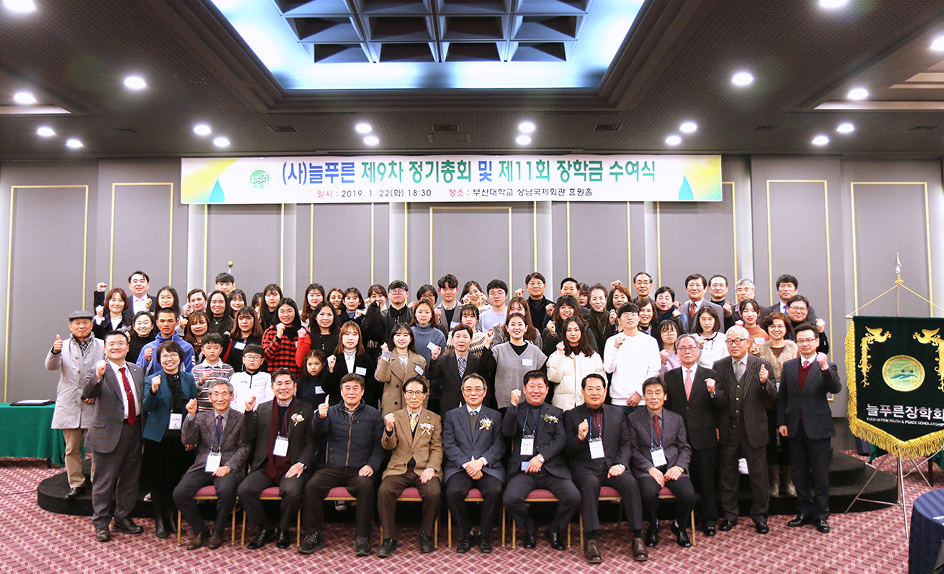(사)늘푸른 2020년 정기총회 개최 알림 관리자2020.02.0432010 첨부파일 30.jpg (사)늘푸른 2020년 정기총회 및 장학금 수여식 1. 일 시 : 2020년 2월 11일(화요일) 오후 6시 30분 2. 장 소 : 부산대학교 상남국제회관 2층 효원홀 3. 장학금 수여 * 부산대학교 사회과학대 학생 * 탈북자 / 다문화 학생 * 개별지정 위탁 장학생 >> 대학생 100만원 /초중고생 50만원 수여 회원님들의 많은 관심과 참여 부탁드립니다. 목록 이전글제12회 늘푸른장학생 신청안내다음글2020년 정기총회 및 장학금수여식 연기 안..
