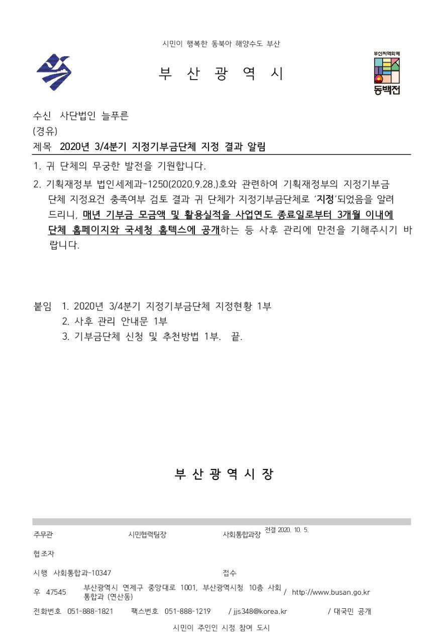 지정기부금단체 지정 결과[부산시 공문] 관리자2020.10.1327306 첨부파일 2020년 34분기 지정기부금단체 지정 결과 알림.jpg 지정기부금단체 지정 결과[부산시 공문] 목록 이전글늘푸른 정기총회 및 장학금수여식 장소 변경..다음글2021년 제11차 정기총회 및 제13회 장학금수여..