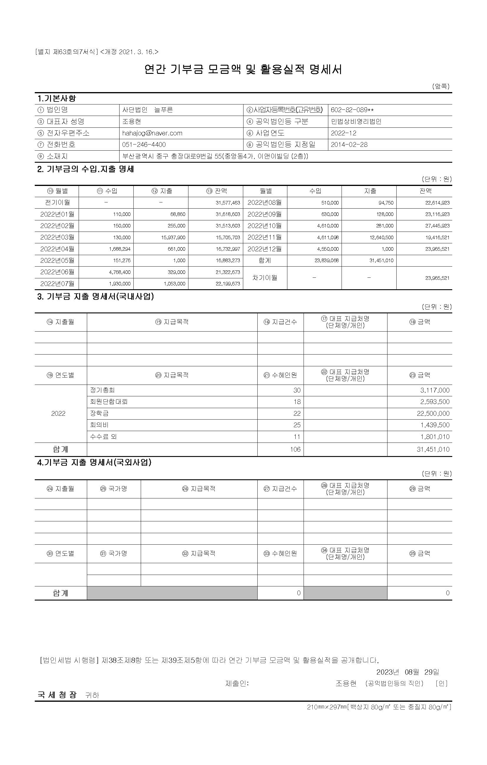 [공개보고서] 2022년 기부금 모금액 및 활용실적 명세서 관리자2023.09.0121461 첨부파일 2022년 공개 보고서 기부금모금액 및 활용실적명세.pdf , 2022년 기부금 모금액 및 활용실적 명세서.png [2022년 공개보고서] 2022년 기부금 모금액 및 활용실적 명세서. 목록 이전글제14회 늘푸른 장학생 신청서(다운로드)다음글제16회 늘푸른 장학생 선발 안내(신청서 다..