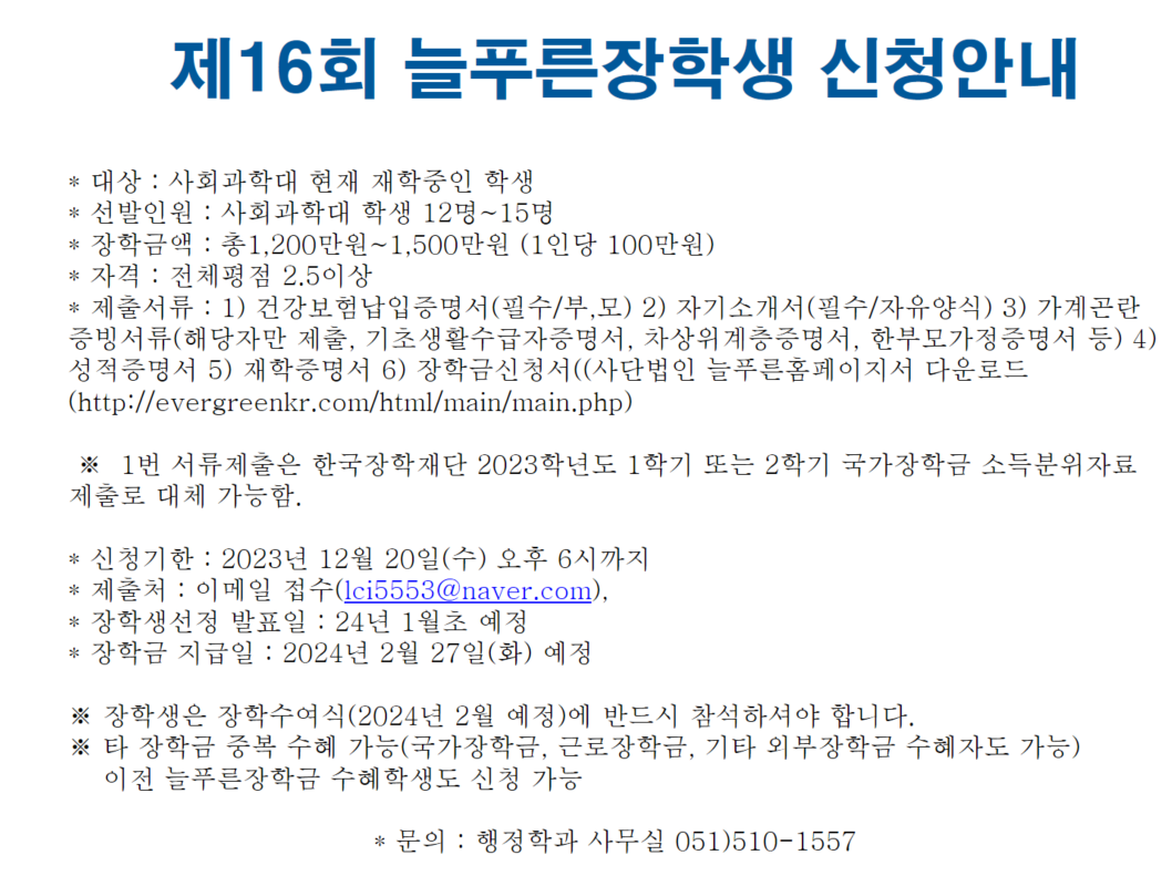 제16회 늘푸른 장학생 선발 안내(신청서 다운로드) 관리자2023.11.2914784 첨부파일 제16회 늘푸른 장학생 선발 공고.png , 제16회 늘푸른장학금 신청서.hwp . 목록 이전글[공개보고서] 2022년 기부금 모금액 및 활용실..다음글늘푸른 제15기 결산서(20241.1.~2024.12.3..