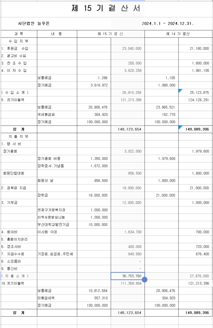 늘푸른 제15기 결산서(20241.1.~2024.12.31.) 관리자2025.04.274760 첨부파일 제15기 결산서.jpg 늘푸른 제15기 결산서(20241.1.~2024.12.31.) 목록 이전글제16회 늘푸른 장학생 선발 안내(신청서 다..다음글다음글이 없습니다.